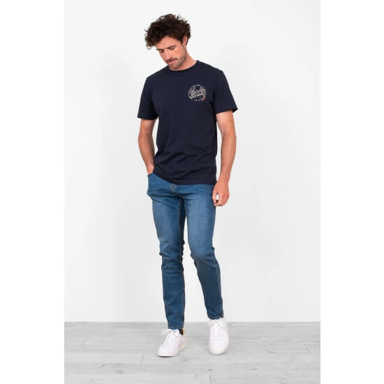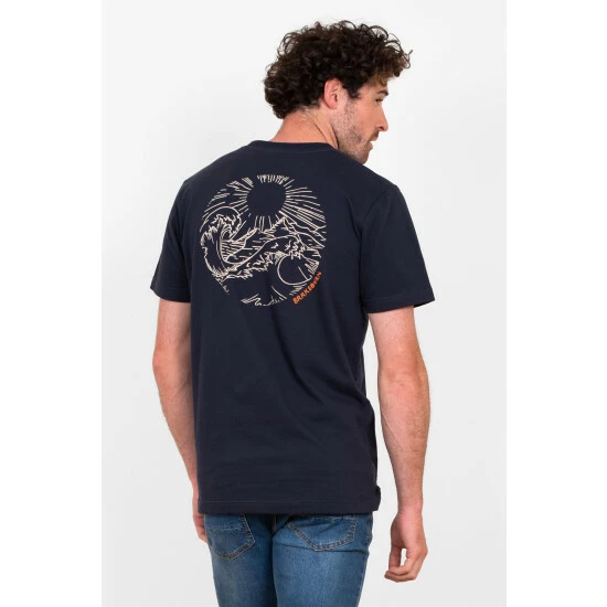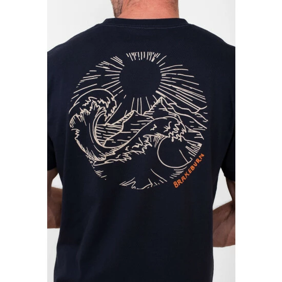 Wear the waves well in this classic men s navy t-shirt with a front and back, lino print-inspired white wave design. Short sleeves, breathable cotton, and a slight stretch around the crew neck neckband all make for a great fit.