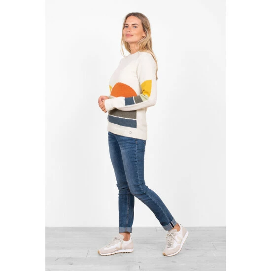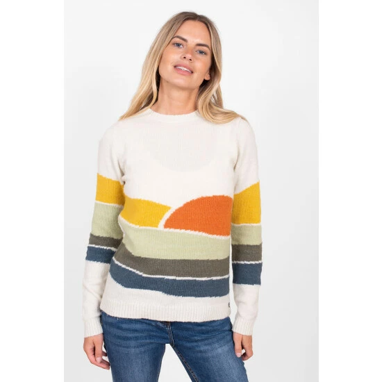 Transport yourself to the water s edge in this winter sunset inspired sweater. With a ribbed cuff, hem and neck this super soft jumper is a style classic to add to your wardrobe this season. You ll also being lessening your environmental impact with over half of the material used coming from recycled polyester.