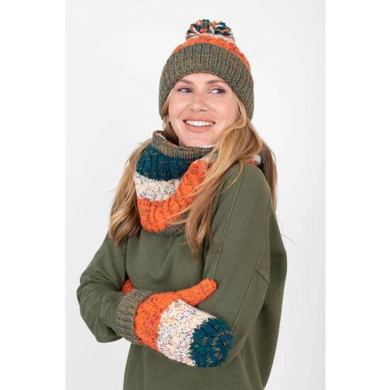 Keep your head warm with the fleecy lining round the hat band, and pair this chunky knit, bobbled, striped beanie hat with the matching mittens and faux fur-lined snood for the ultimate coordinated set.
