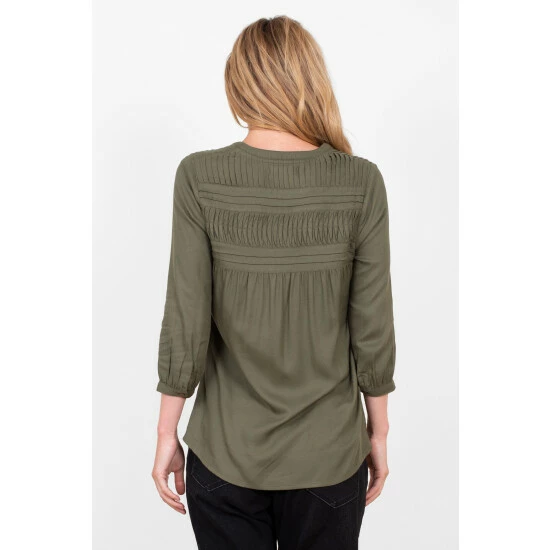 Dress up for winter in this fabulous notch neck pleated blouse. The winter moss green adds warmth, and the soft viscose fabric has a flattering flowy drape and the slight gathering on the button-up cuffs make for a lovely silhouette.