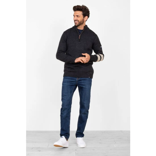 This grey 1/4 zip jumper is your new wardrobe favourite. Its zip-up funnel neck and wool content bring the warmth, while the bold sleeve stripes bring the style.