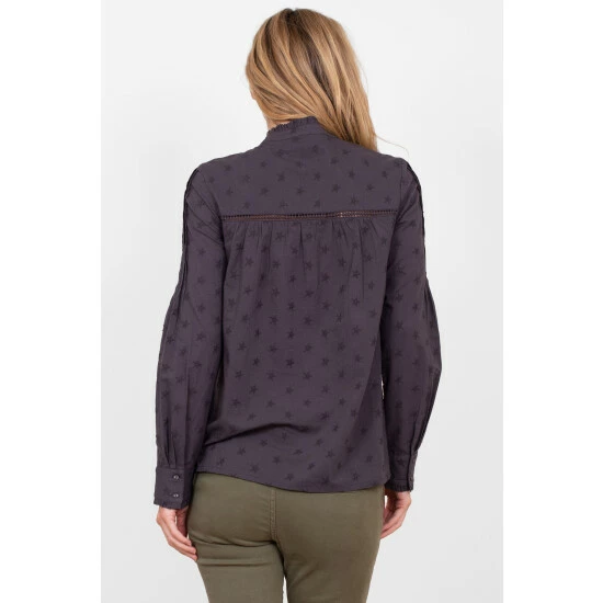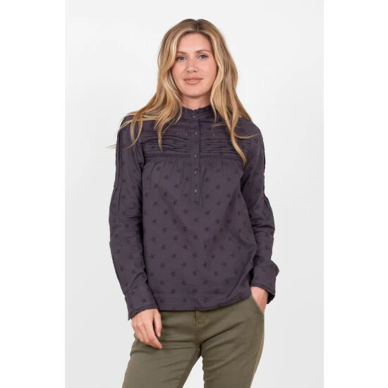 Add some simple style to your wardrobe this Autumn with our Lumi embroidered blouse. A slightly more structured fit and pin tuck detailing across the chest adds a stylish twist to a classic top. The embroidered stars give a pop of colour while frill detailing on the cuff and neck add a subtle charm. Features fabric covered buttons and long sleeves. Made using breathable cotton.