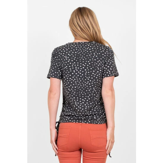 Wishing for snow? Why not wear it into existence – this grey spotty t-shirt has definite snow storm vibes. The modal in the cotton mix fabric makes it super soft and floaty. Featuring short sleeves, crew neck, and stylish tie details on both sides.