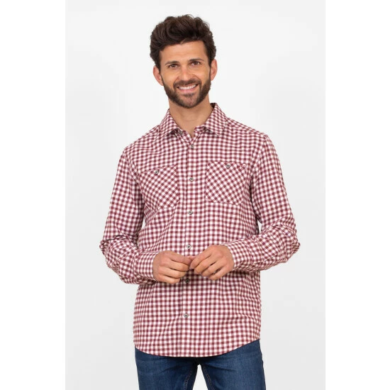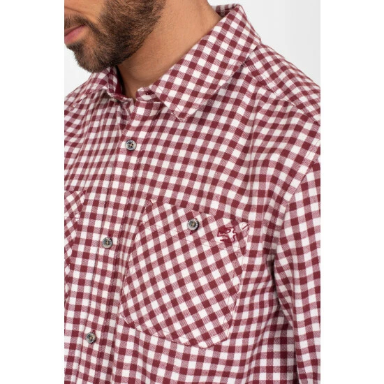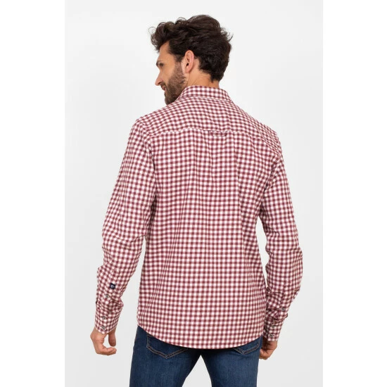 Look great on cool days in this stylish burgundy gingham shirt. Featuring long sleeves, classic button-through fastening and button-close top pockets as well as button-up cuffs which can be rolled up and buttoned at the elbow. It also has a handy hanging loop on the back. Made from pure cotton.