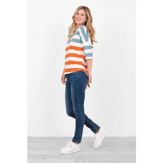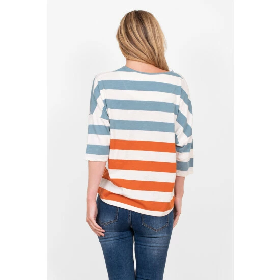 Add a bold stripe flair to your wardrobe with this oversized 3/4 sleeve t-shirt. The round neck, drop sleeves and stretchy breathable cotton fabric make for a super comfortable wear.