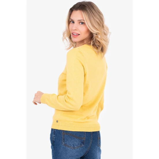 Bring sunshine to everyone s days in this classic long sleeve yellow cardigan. It s a soft knit with a contrasting stitch on the cuffs, round neck and hem, and made extra special with fine stitch detailing and pearl-effect buttons, Made from 100% organic cotton.