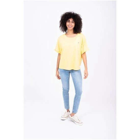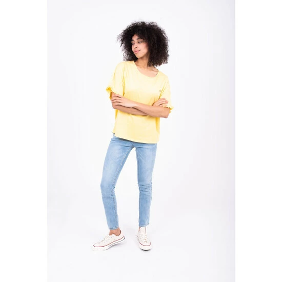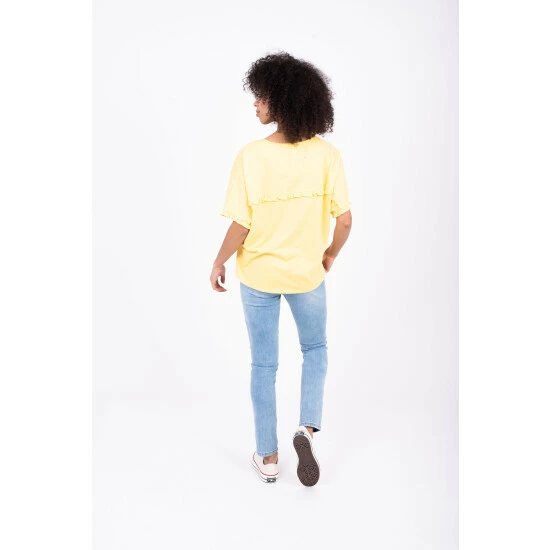 A wardrobe builder with a twist, this dropped short sleeve yellow t-shirt features subtle frill detailing on the sleeves and across the back. A cotton round neck tee making for comfortable casual wear.